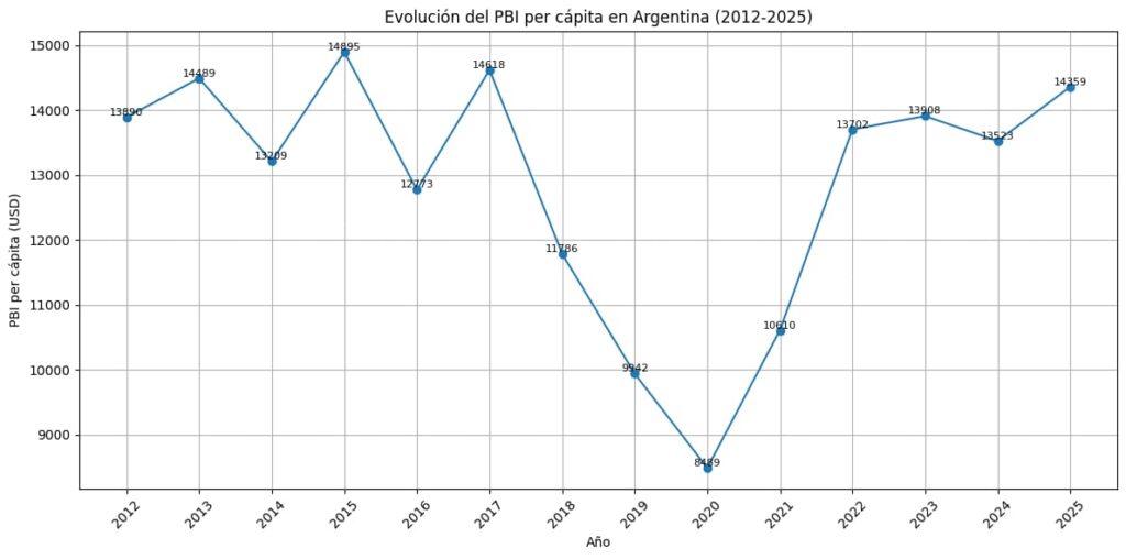 El producto bruto se encuentra estancado desde hace (casi) 15 años, sobre todo si hacemos doble click en la forma más minuciosa de medirlo, que es su nivel per capita. Observemos el siguiente gráfico para apreciar el proceso.